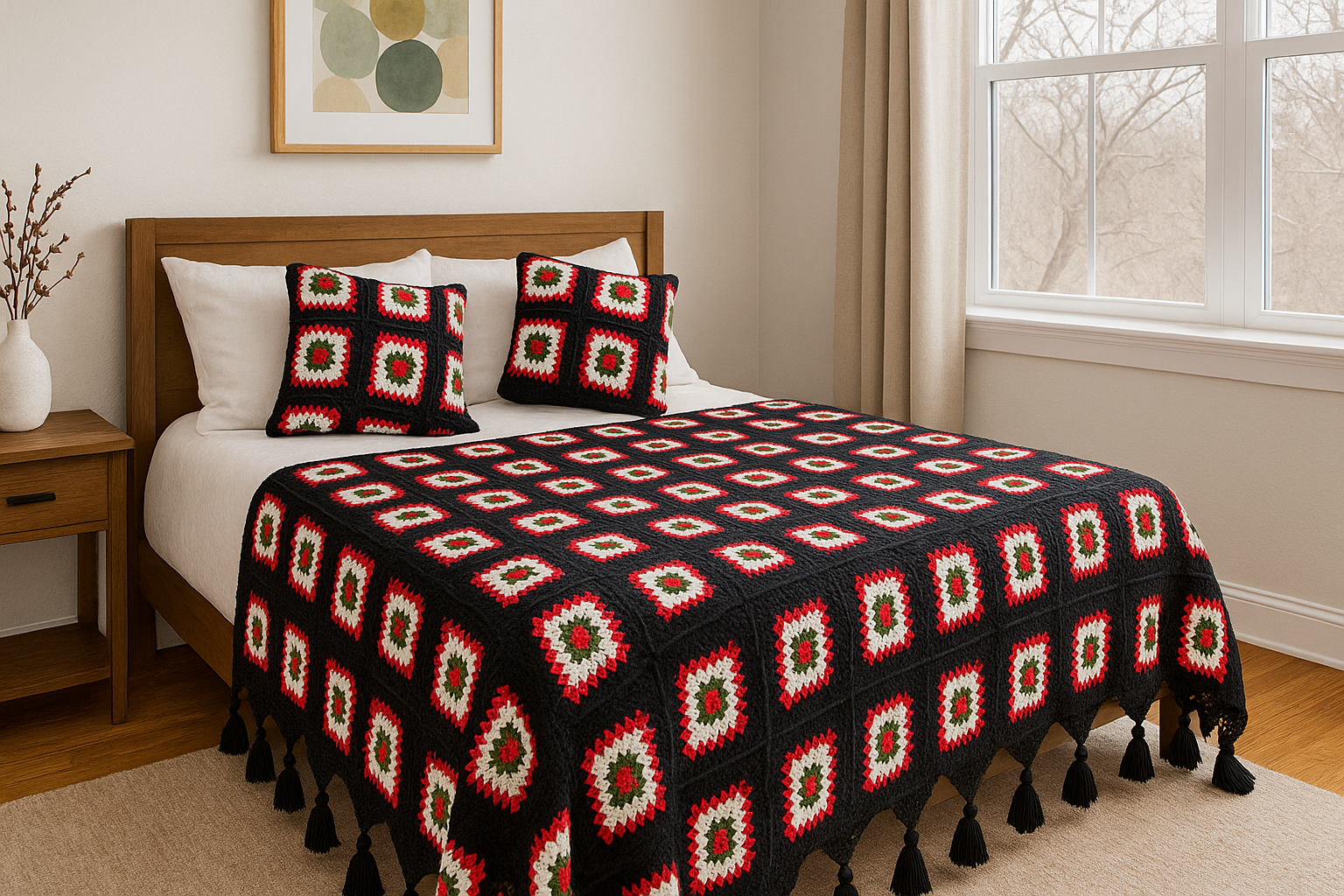 Handwoven Red & Gold Cotton Bedspread with Fringe