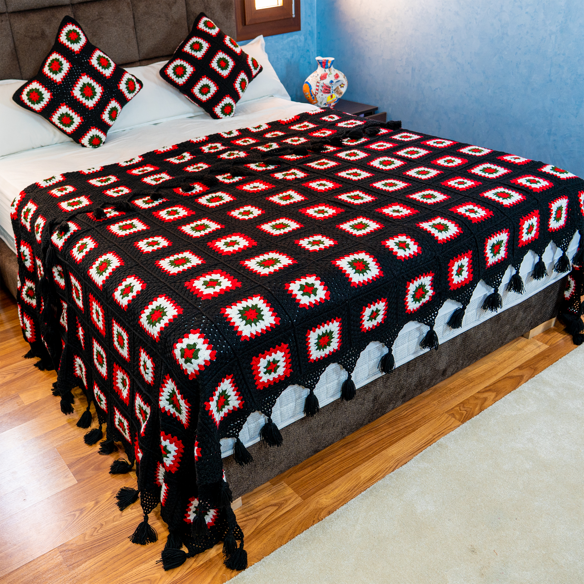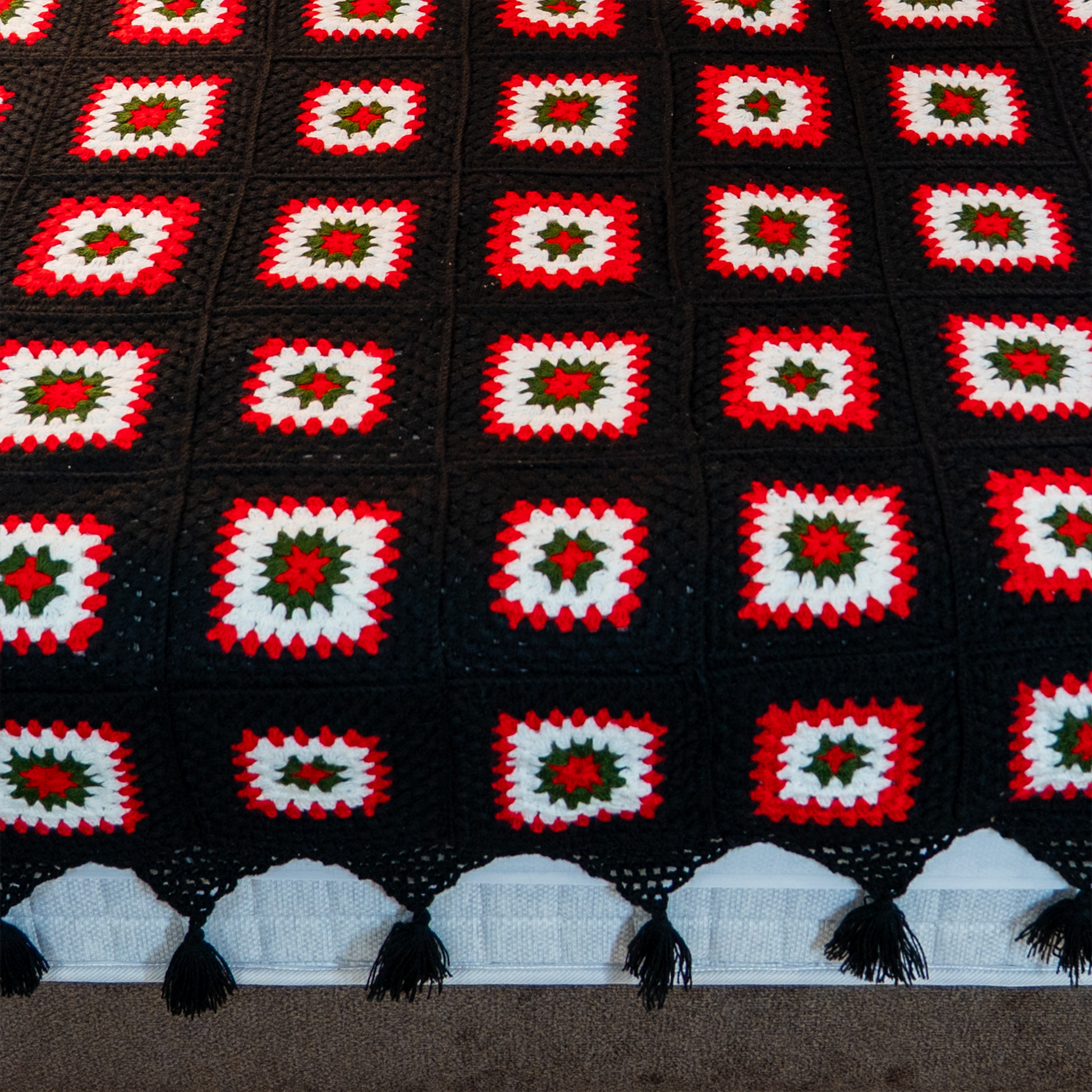 Handcrafted crochet bedspread in 100% wool—soft, warm, and made to stand out with iconic granny-square motifs in red, white, and green on a deep black field.
