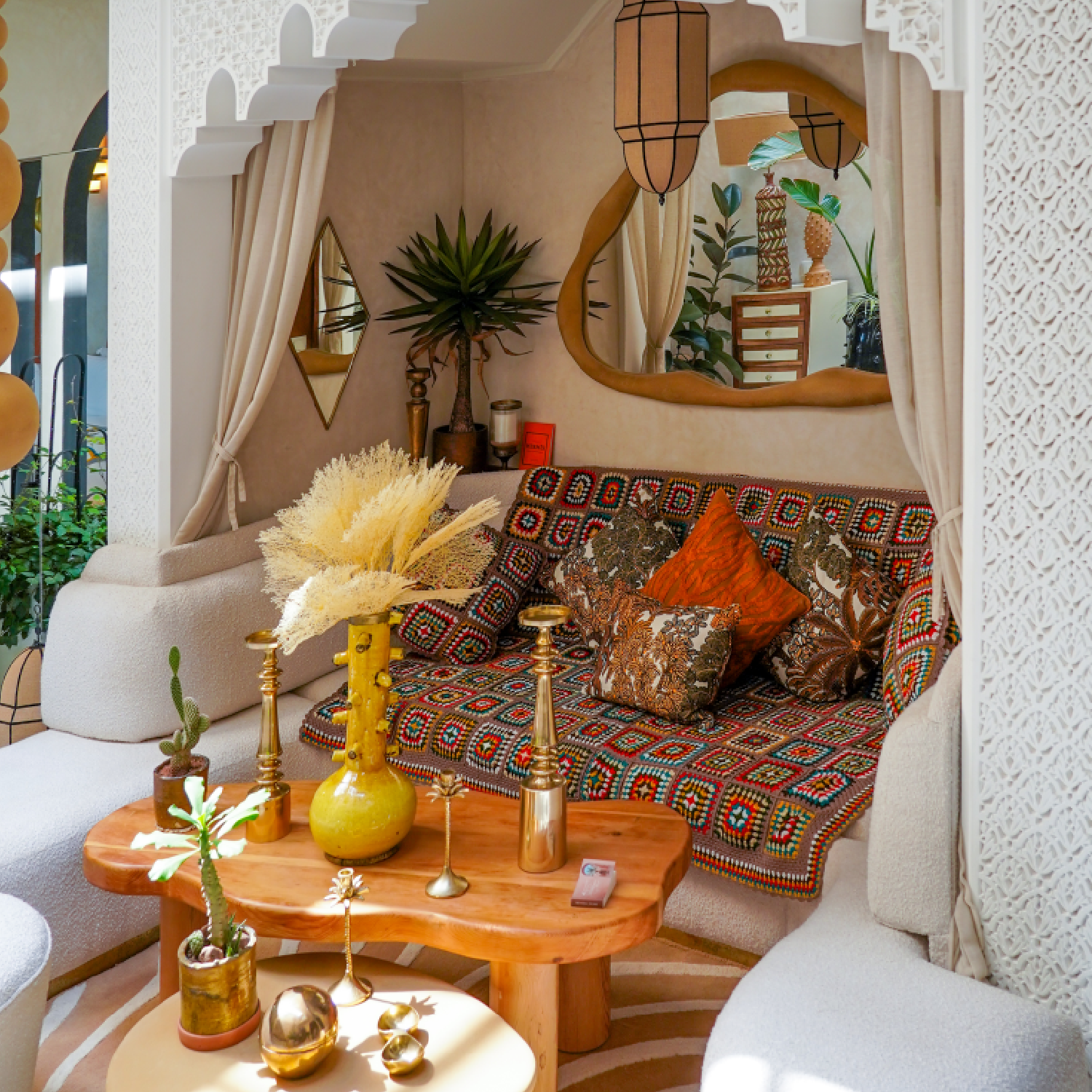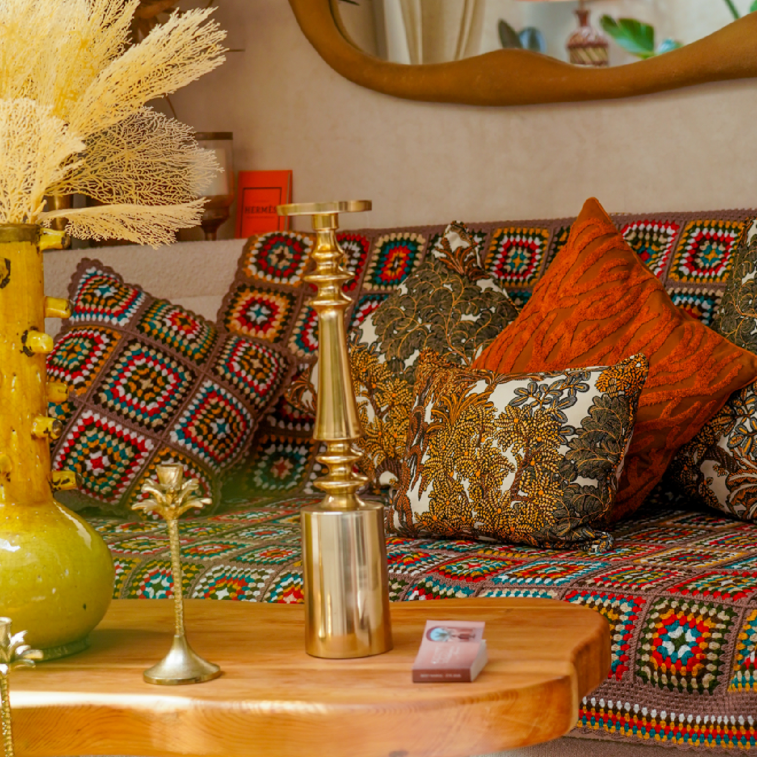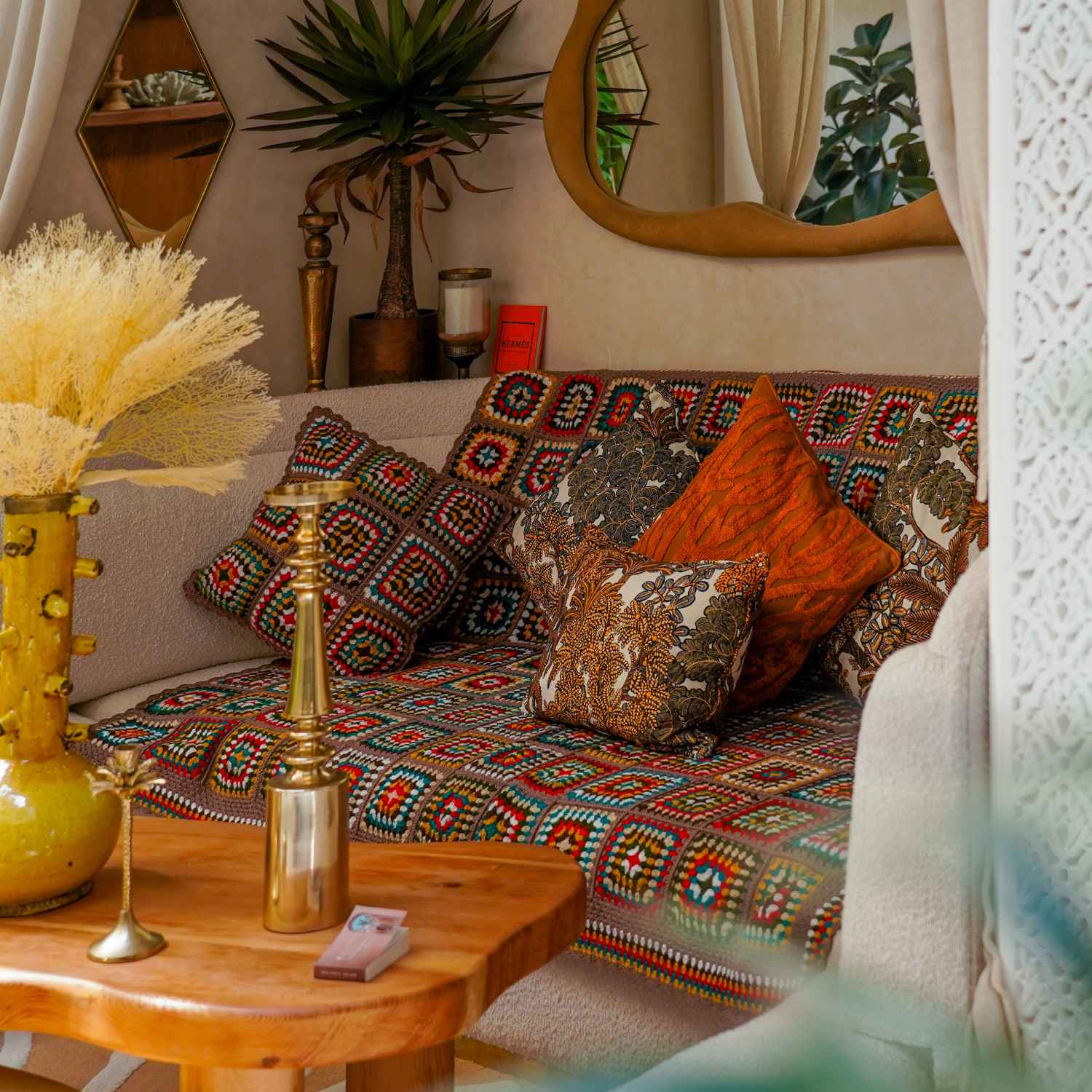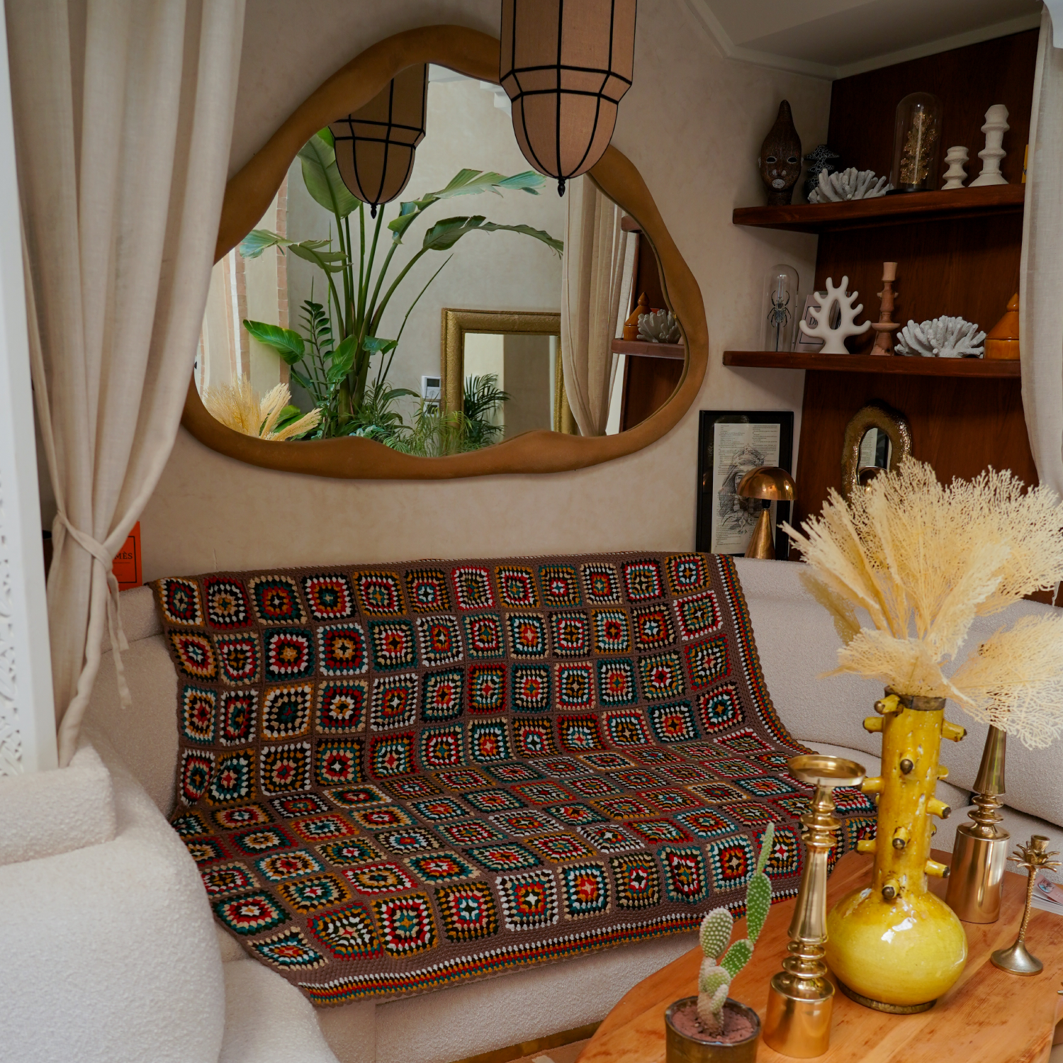 Hand-crocheted by a mother of eight from the Atlas Mountains, the Mom Blanket wraps your space in warmth. Earthy browns with lively granny-square pops (teal, red, mustard, cream) deliver timeless, cozy character for sofas or beds.